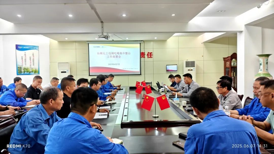 6月7日,仙粼化工召开集中整治违规吃喝工作部署会。会议传达了《中央层面深入贯彻中央八项规定精神学习教育工作专班、中央纪委办公厅关于2起党员干部违规吃喝、严重违反中央八项规定精神典型问题的通报》,深入学习了省委党的建设领导小组《关于转发〈关于集中整治违规吃喝的通知〉的通知》和集团、长江化工违规吃喝集中整治动员部署会精神。党委书记、董事长李元海出席会议并讲话,党委委员、副总经理朱远鹏主持会议。
